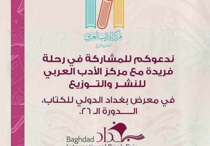 يشارك مركز الأدب العربي للنشر والتوزيع، في معرض بغداد الدولي للكتاب 2025، في دورته الـ 26، المقامة في أرض معرض بغداد الدولي، قاعة بغداد جناح (D20)، وذلك خلال الفترة من 10 إلى 21 سبتمبر 2025.